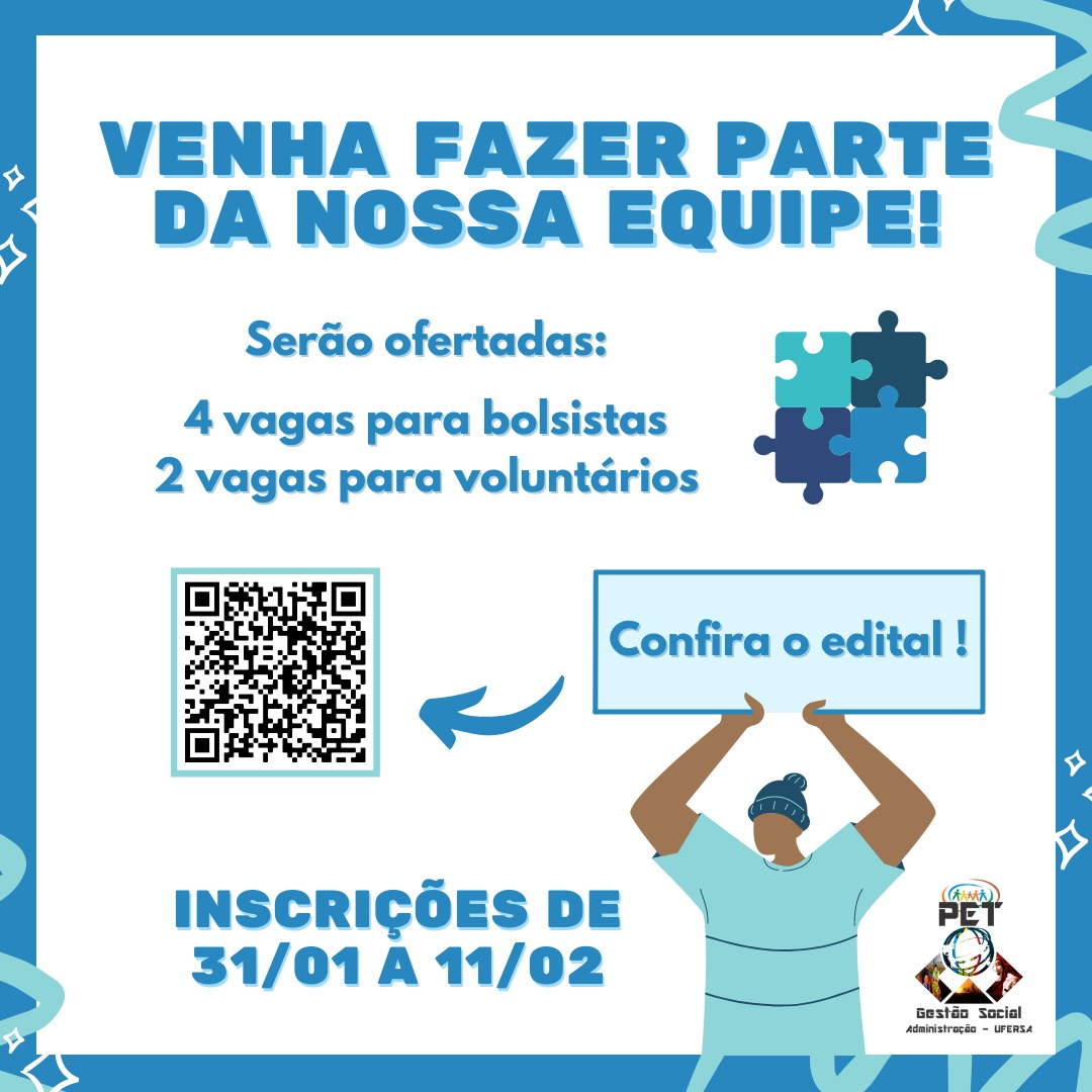 PET Gestão Social abre inscrições para seleções de bolsistas e voluntários. Segue o link do edital: