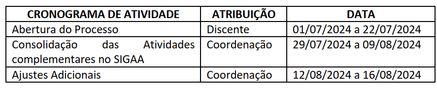 Informativo sobre Atividades Complementares Sem categoria 28 de maio de 2024. Visualizações: 728. Última modificação: 28/05/2024 18:06:48 Foi lançado o Informativo sobre as Atividades Complementares para o semestre 2024.1. Confira todas as informações aqui!