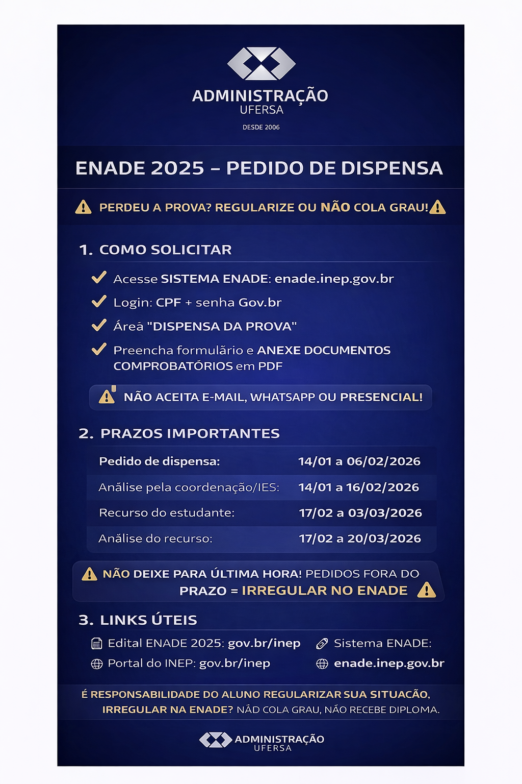 ENADE 2025 – PEDIDO DE DISPENSA Estudante, Processos Seletivos 13 de janeiro de 2026. Visualizações: 41. Última modificação: 13/01/2026 09:34:48